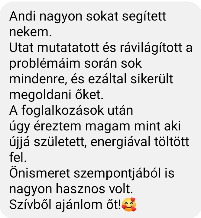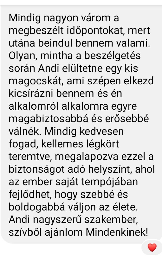 „Hálás vagyok a sorsnak, hogy Téged hozott az utamba. Imádtam minden percét, és mindig vártam a következő időpontot. Nem tudok elég hálás lenni az érdekes feladatokért, tartalmas beszélgetésekért, amelyek hasznosak, barátiak voltak. Örülök, hogy pont Te voltál ott, ahol nagy szükségem volt valakire.”